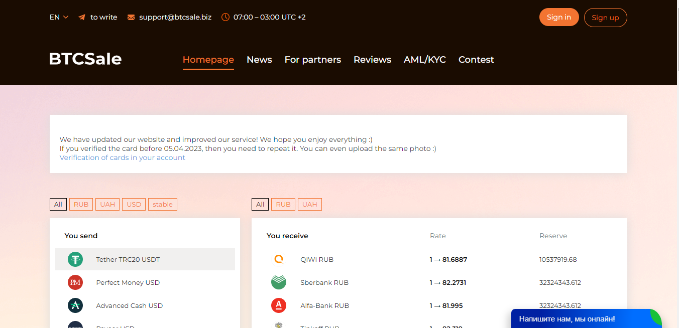 You can also transfer rubles to Advanced Cash and Payeer accounts. BTCSale supports automatic transactions 24/7. When exchanging some cryptocurrencies, the service performs an AML check of the transaction. If the wallet address or sent coins have a high or medium risk, are associated with illegitimate sources, the client’s identity is verified, which takes 1-2 business days.