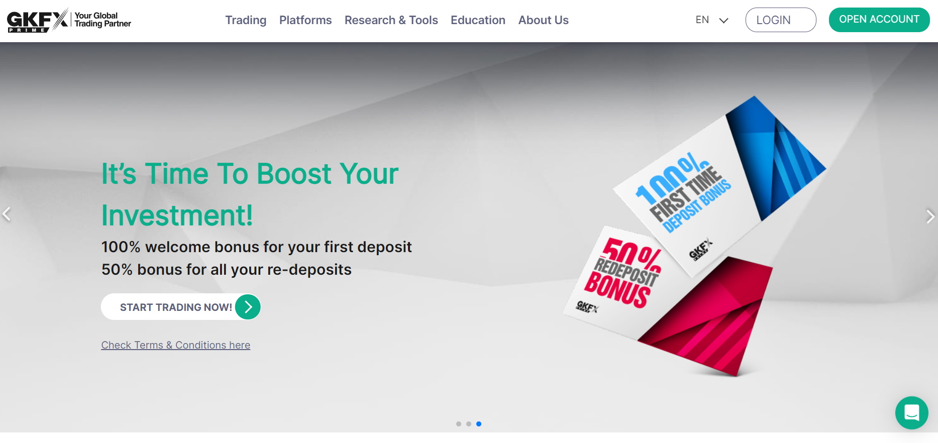 • GKFX Prime started its operation in 2012, becoming a globally leading broker with innovation and world-class customer service. The broker serves clients in more than 20 countries, speaking 12 languages.
