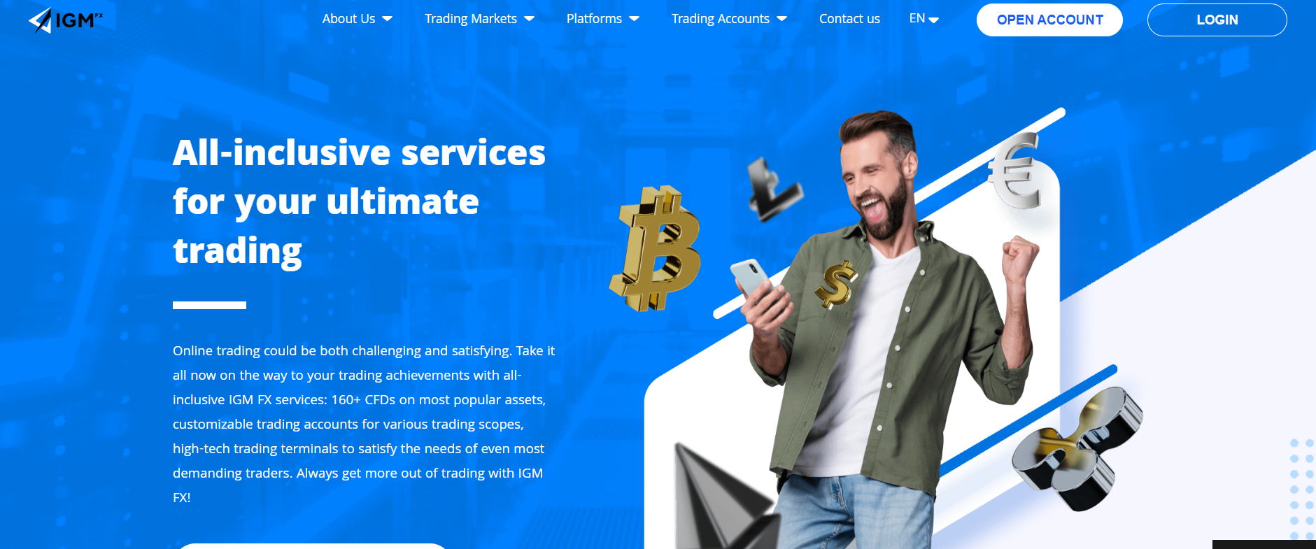 IGM FX is a CFD and Forex trading broker that was founded in 2016 in Cyprus. The brokerage firm offers a wide range of trading products, including more than 160 CFDs on assets such as Forex, Stocks, Indices, Commodities, Metals, and Cryptocurrencies.