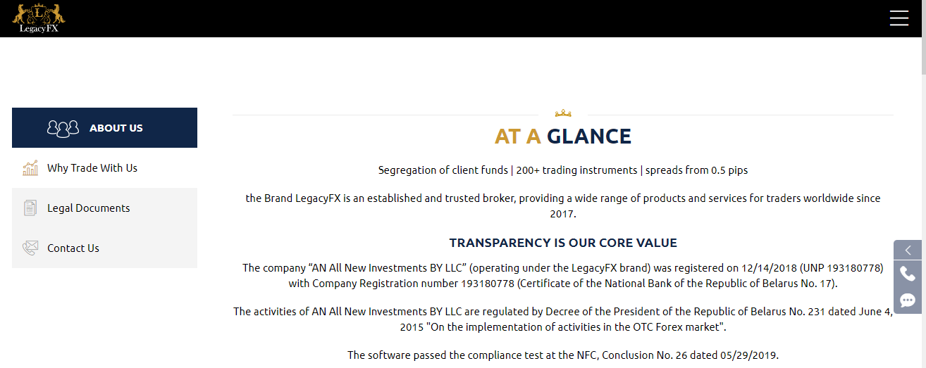 The company “AN All New Investments BY LLC” (operating under the LegacyFX brand) was registered on 12/14/2018 (UNP 193180778) with Company Registration number 193180778 (Certificate of the National Bank of the Republic of Belarus No. 17).